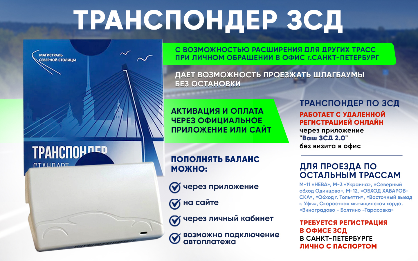 ВНИМАНИЕ! Транспондеры ЗСД, позволяют оплачивать проезд на иных платных трассах в рамках интероперабельности (роуминга) только после их персонификации (регстрации) в офисе ЗСД в г.Санкт-Петербурге лично с паспортом!!!